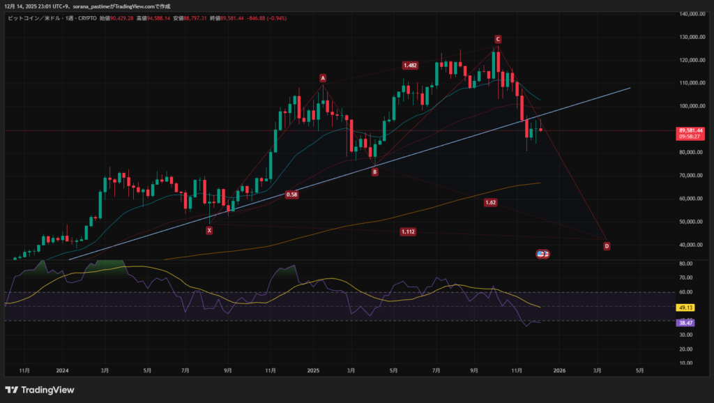 週足がこのまま「上髭陰線」で確定するようなら、$70k台へ下落する可能性が高いです。