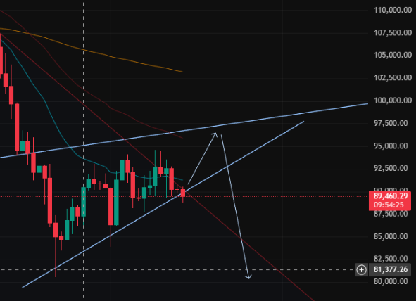 3週間ほど$80k~90k台でヨコヨコする展開であまり変化はないですが、トレンドは下方向と見ています。