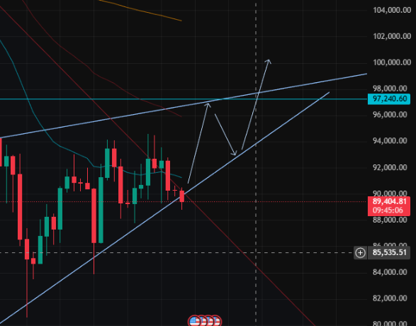 日足移動平均線もデッドクロスしており、週足トレンドラインの抵抗もあるため、仮に$96kあたりまで上がってきてもショートを狙います。